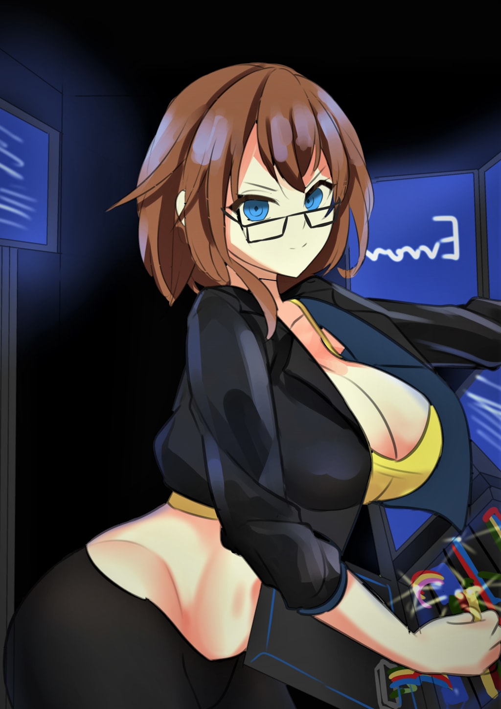 The researchers left the room and activated the security system. Just moments after the researchers leave the premises, a young woman appearing to be in her mid 20s is standing on top of the roof of the research facility. She had a very fit, yet voluptuous physique; and wore a yellow tank top that exposed her midriff as well as her ample cleavage, dark jeans that clung to her thighs, boots, and a fitted black blazer jacket that hugged her body. She also wore glasses which gave her a very sophisticated look.