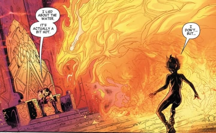 The issue strips through Namor's facade, though, as Namor — who believes his death is imminent — allows Jean to step into his mind. She's staggered at what she learns, as she realizes that the Phoenix fire burned Namor as badly as it did all the other Phoenix Hosts. He simply hides that fact better than most.