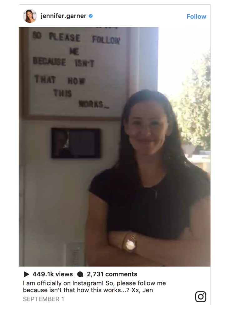 A new month has brought a new celebrity to Instagram. Jennifer Garner shared her first post on Friday, September 1st, and the response from fans has been more than enthusiastic. The star's page is averaging 27,000 new followers an hour, and the video post has already been liked more than 13,000 times.