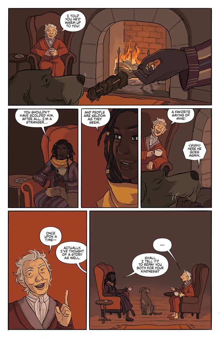 I am loving every moment of how this is being told. The story & plot development that we see through how the sequence of events unfold as well as how the reader learns information is presented extremely well. For a change of pace our regular storyteller has been supplanted for an issue thanks to an unexpected visitor to his home. The idea of a story in gratitude for the hospitality shown harkens to a much older age and there’s a sentimentality to it that has all but been forgotten. The character development that we see is fantastic and as much as our three newfound friends as the characters in the featured story are all fleshed out extremely well. The pacing is superb and as it takes u s through the pages revealing the story it really is just so beautifully done.