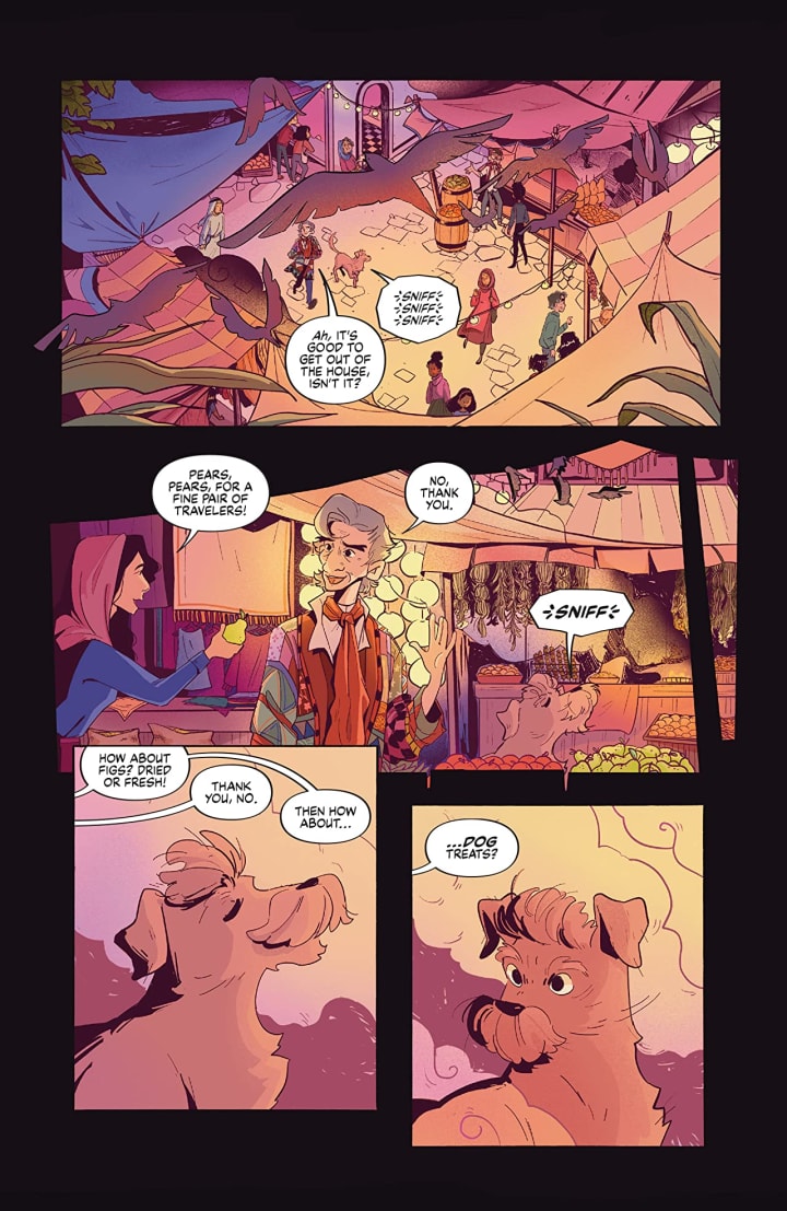 The interiors here are absolutely lovely. I feel like we’re looking at the illustrations in a children’s book and how that effects the reader is spectacular to see. The linework is beautifully laid down and how we see the varying weights being utilised to create the detail work we see is extraordinarily well rendered. That we see backgrounds being utilised as we do and how they work within the composition within the panels bring out the depth perception, that sense of scale and the overall sense of size and scope to the story. The utilisation of the page layouts and how we see the angles and perspective in the panels show an extremely talented eye for storytelling. The colour work is beautifully rendered as well. There is a subtlety to the colour choices that worlds exceptionally well within the confines of this story. The way we see the various hues and tones within the colours being utilised to create the shading, highlights and shadow work is delicately done that it feels like a dream coming to life. The eye for colour is extraordinary here and it just resonates with the reader on so many emotional levels.