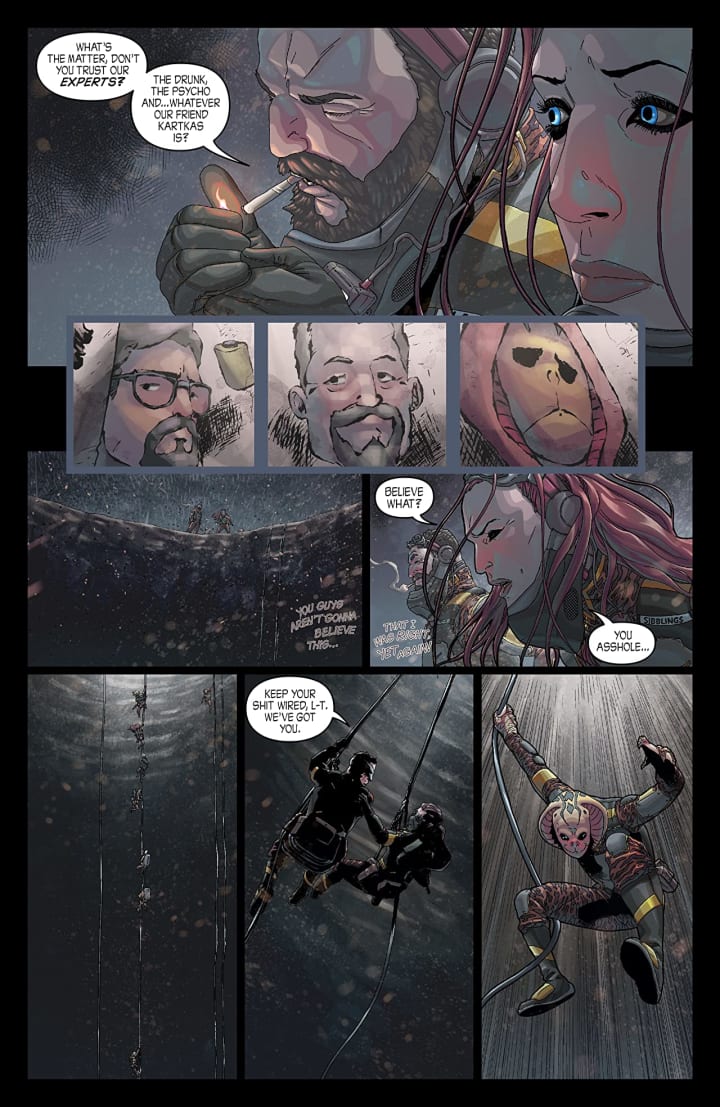 The way that we see things escalate as they go from section to section means the remainder of the team has little time left to accomplish what they hope to do and find a way to get out of there alive. While this landscape is far from idyllic at first glance it also just looks like a cavernous underground lair so this belies the hidden dangers that they face. With some absolutely amazing writing and dynamic characterisation that goes hand-in-hand with these bloody brilliant interiors will forever change the way you view Hell.