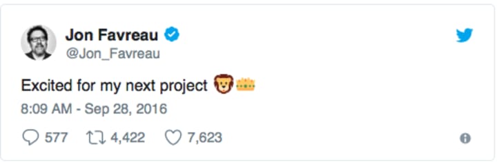 Hot on the heels of his resounding success on The Jungle Book, the internet was sent into a frenzy of speculation following a mysterious tweet from it's director, Jon Favreau. A Lion and a crown? What movie is that? Wait...surely not...