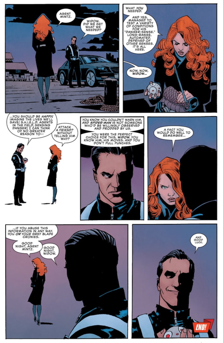 There's nothing to say that the two spider-themed heroes will get along in the sequel, as this recent comic shows. After Spidey successfully prevents a mugging, he suddenly finds himself under attack from Black Widow. After catching him unaware, she tests his spider-sense to its limits and delivers the information to the mysterious Agent Mintz.