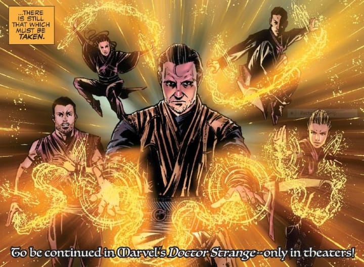 The comic ends as Kaecilius gains the trust of his students to perform a joint ritual as mentioned in one of the scriptures. They storm the Kamar-Taj Library in the middle of the night with the belief "While there is certain knowledge that can be given, there is still that which must be taken."
