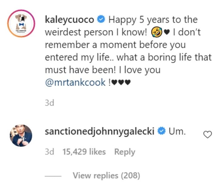 In the comments section, Galecki responded to Cuoco's seeming suggestion that she didn't remember him at all, and that her life was "boring" when they were together. His one-word response read, "Um."