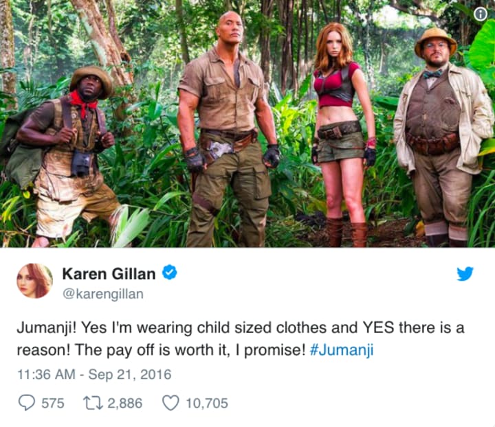 Last month, the internet went into meltdown when the first set picture of the film (slated for a 2017 release) was revealed. Looking more like Lara Croft than wholesome family fun, Gillan took to Twitter to quell suspicions that she was just there to ramp up the film's sex factor. Somehow the words "Jumanji" and "sex factor" don't really mesh too well: