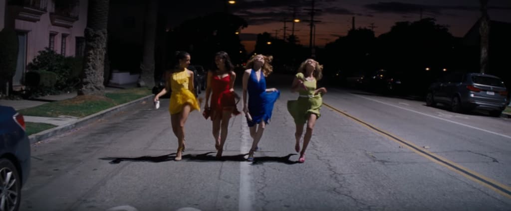 During the "Someone In The Crowd" sequence, we see Mia emerge from her apartment and join her friends on their way to a booming Hollywood party. As if we needed more proof that Robbins is in complete control of his steadicam, the video shows him walking backwards toward a platform that shoots him into the air as he films - one-handed, by the way! - the night sky and four friends below. Major props also go out to the guy below holding onto that rope for dear life.