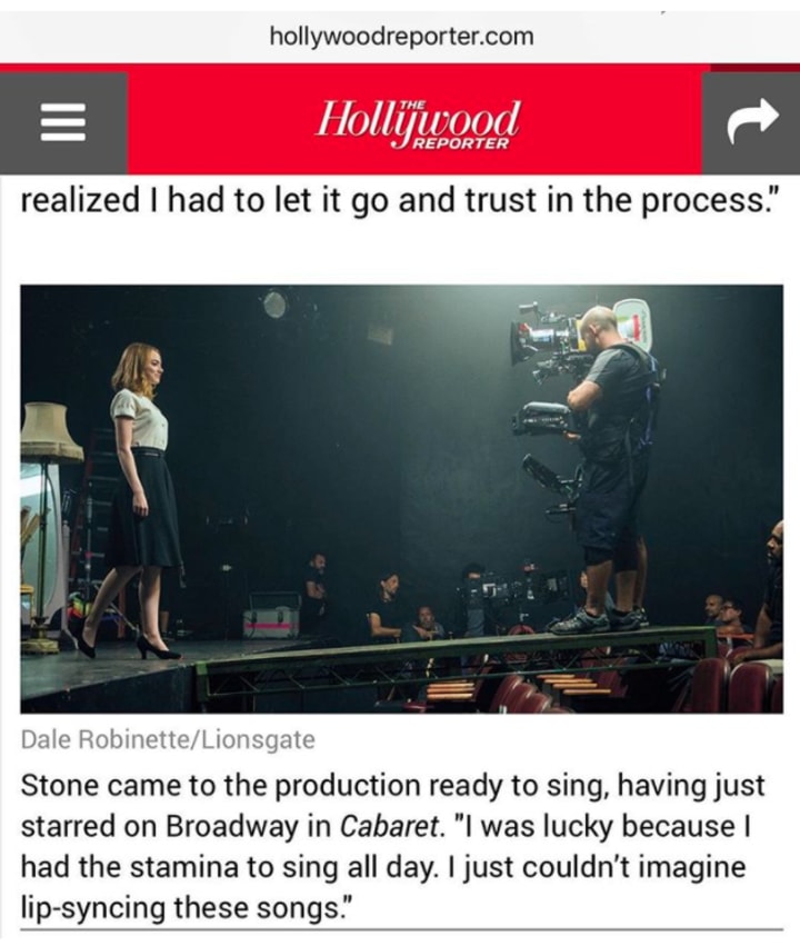 Robbins screen shots a piece from The Hollywood Reporter which shows him on a runway platform attempting to get that perfect shot from Stone.