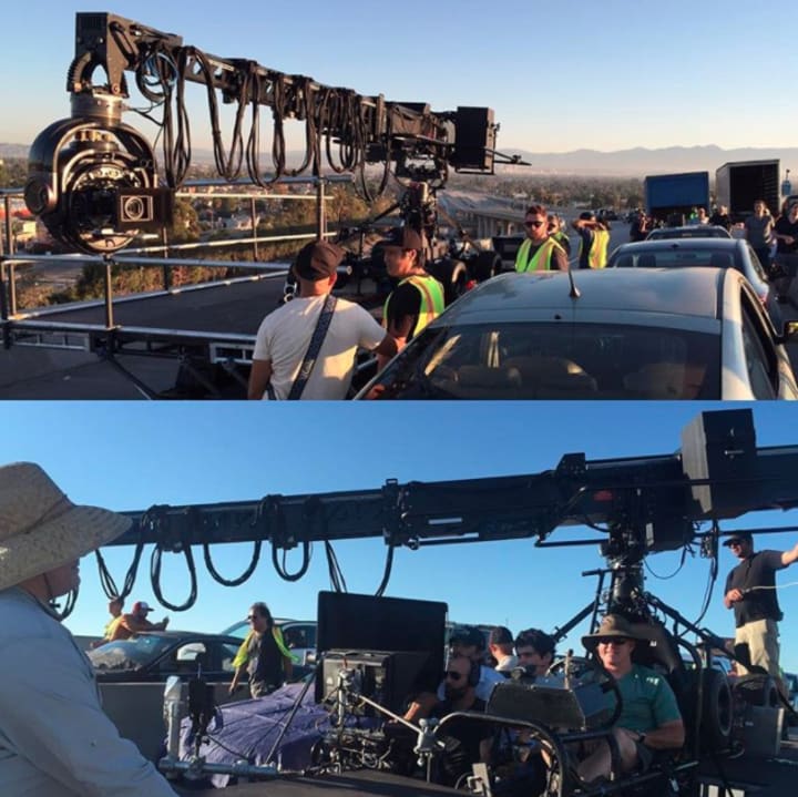 Robbins soars above the blonde woman to get that final incredible shot of the busy Los Angeles highway. He also demonstrates the insane amount of people it took to film that sequence which is truly just a fragment of the dozens of other cast and crew members.