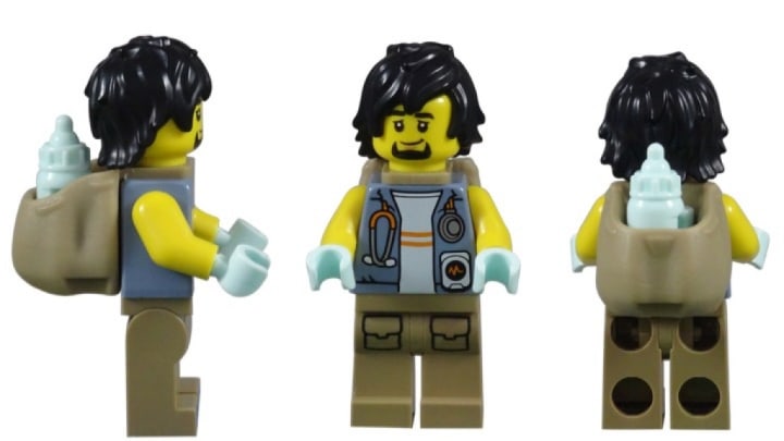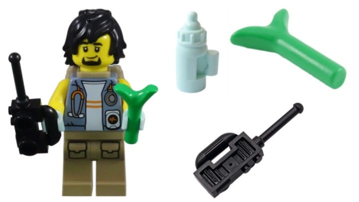 In the strictest use of the word, the veterinarian with his walkie-talkie is an original minifigure. However, that is only because of the dark tan open backpack that he is wearing to carry the light aqua baby bottle. The character itself appears in two other Jungle Exploration sets. The dark tan cargo pants with pockets, the sand blue vest jacket over a white shirt with orange stripe, the single sided head piece and black tousled hair with long bangs are the exact same pieces used to create the other minifigures. The same design is also used for the Medic Minifigure found in 4 of the Arctic Explorer sets. Although, that series had the colors of his clothes better match the icy environment of the theme. I do love the printing on the torso piece. Especially that stethoscope and electronic device sticking out of his pocket. The goatee on the face is fantastic! It adds a lot of personality to the minifigure. I like the fact that this character can be found working in different natural environments. It helps show that the Jungle Exploration sets are part of the larger Explorer theme that opens up the natural world to LEGO builders.