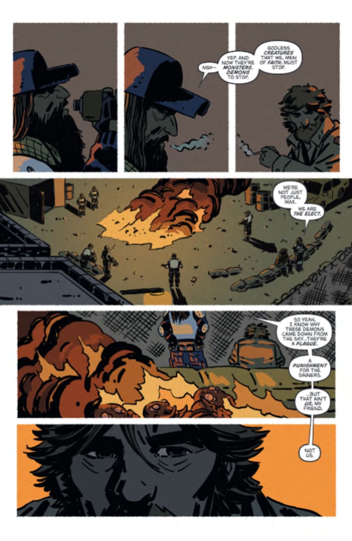 I am immensely enjoying this series. Massimo is taking us through the apocalyptic event in a way that we’ve not seen before. Sure Max and his mum aren’t religious people but they are taken in by this group led by Ford who is turning more and more into a religious zealot who is willing to kill people in the name of his newly formed religion. Because why not? Let’s use people as sacrifices to remain clean and not be turned into these giant human eating ravenous locusts. We see groups of survivors who encounter the religious nut after a while but to start off there is new for us and I like this innovative take on the genre because it’s the least expected way to tell a story.