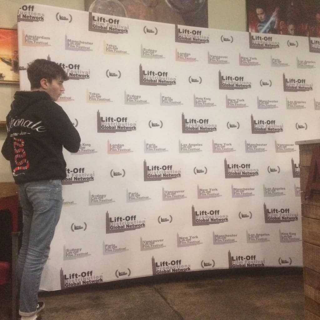 The festival was held in a small and independent cinema, called Arthouse, in North London. The place was chilled and felt like home with a bar and some tables for people to drink something while waiting for their movie. Because of how the festival was organized, the audience and the filmmakers could interact together in an informal environment. Due to the amount of people in the lobby of the venue, most of us remain standing. There was a banner with the logo of the Lift-Off so that people could approach and have a picture in front of it, this was the red carpet part of the event and all the filmmakers were asked to have a picture there, but it was for everyone.