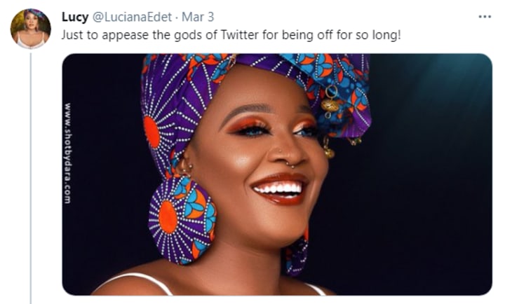 The entire ordeal started on March 3rd when Lucy returned to Twitter to post a beautiful picture of herself saying: “Just to appease the gods of Twitter for being off for so long!”