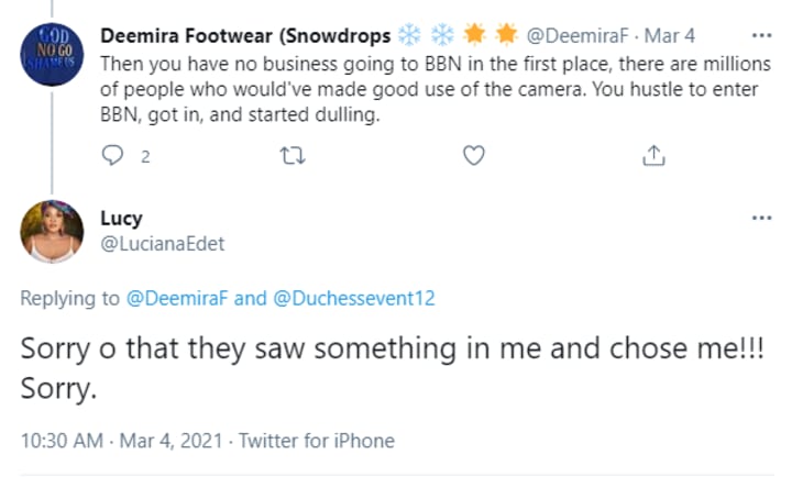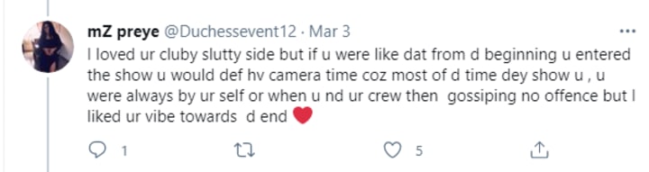 I loved ur cluby slutty side but if u were like dat from d beginning u entered the show u would def hv camera time coz most of d time dey show u , u were always by ur self or when u nd ur crew then gossiping no offence but I liked ur vibe towards d end ❤️