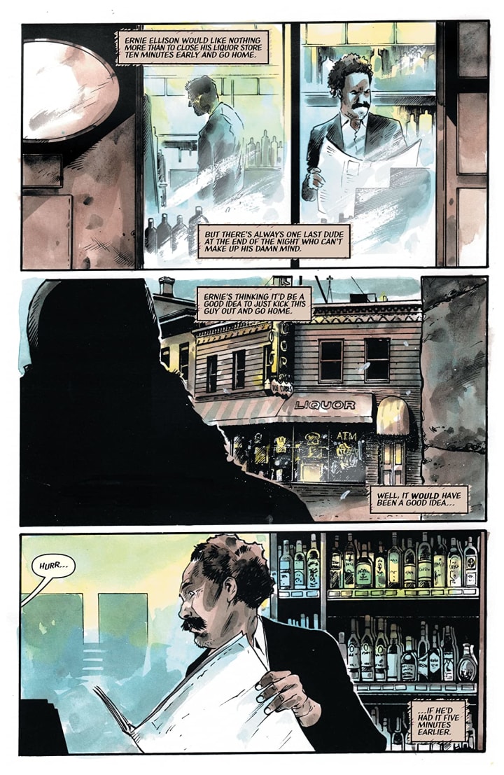 Oh I love Andrea’s work and the work he does within these pages just showcases why. The attention to detail that we see right off the bat, the bottles of booze for instance, thanks to this stupendous linework and its varying weights and techniques. How we see backgrounds and the composition within the panels enhance and expand the moments as well as bring out the depth perception, sense of scale and the overall sense of size and scope to the story is magnificently rendered. The utilisation of the page layouts and how we see the angles and perspective in the panels show a masterful eye for storytelling. The watercolour effect of the work is simply stunning. The various hues and tones within the colours being utilised to create the shading, highlights and shadow work shows such a masterful eye for how colour works. Andrea is one of today’s most exciting artists.