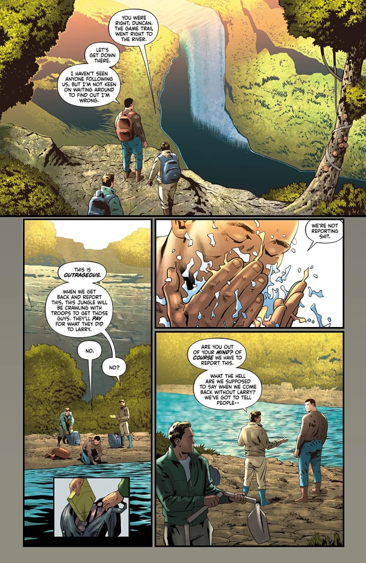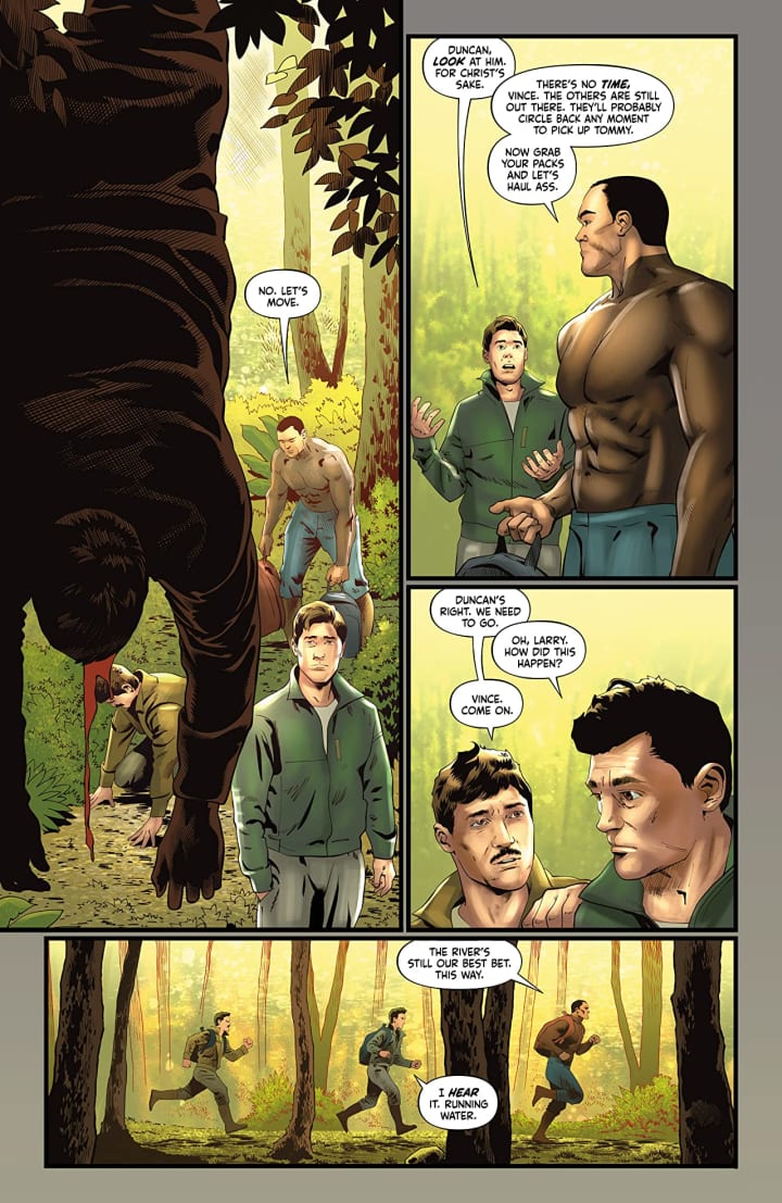What isn’t there to like about seeing a group of guys being hunted throughout an Island retreat? From the first issue we knew what we needed to about these guys and they were jerks no ifs ands or buts about it. So when they were ambushed and things started happening I found it hard to root for them. These distinct personalities that Victor has given each person is so whole and almost complete that its easy to understand how different and yet close to the same the men are. This has all the excitement of a feature length thriller though it’s much more intelligently written than your normal standard film fare.