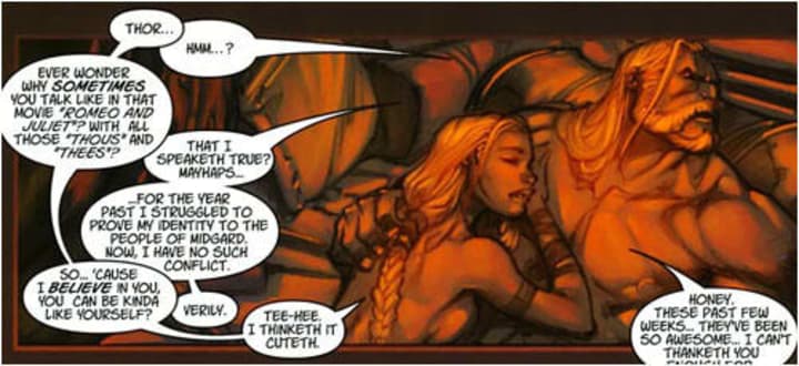 Thor and Valkyrie - cuddling up in the comics. [Credit: Marvel Comics]
