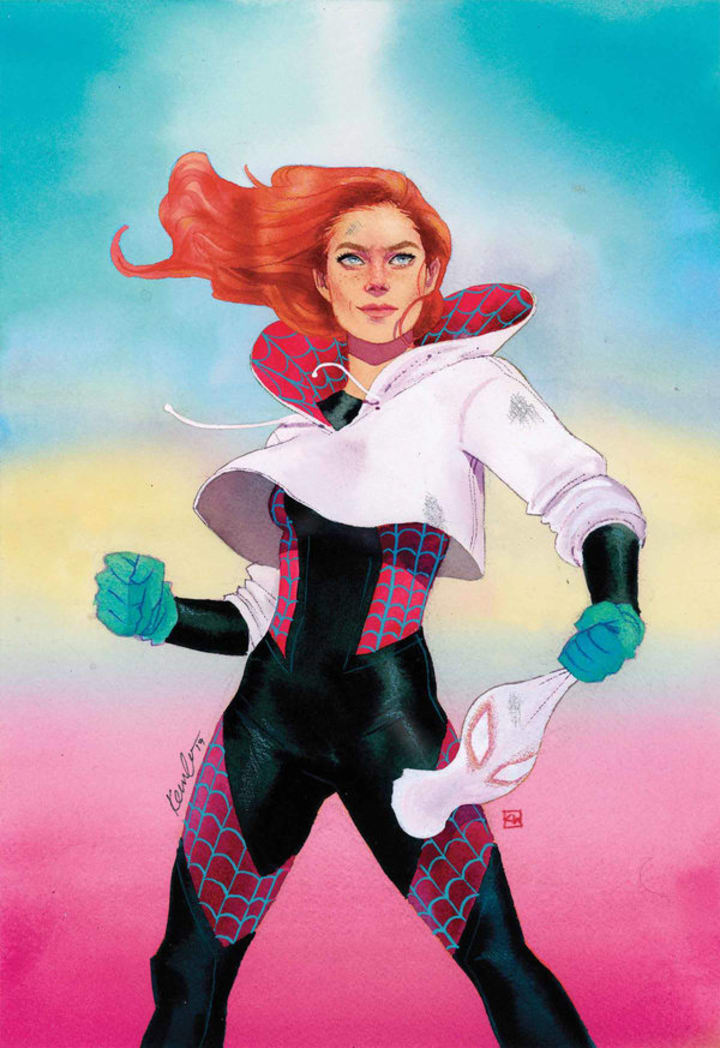 In what can only be described as the most surreal of the variant covers, Kevin Wada envisions Mary-Jane as Spider-Gwen. Given Spider-Gwen is an alternate-universe version of Spider-Man where Gwen Stacy was the one bitten by the radioactive spider, this variant can only be described as a head-spinning idea!