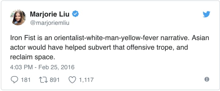 Would casting an Asian man as Iron Fist instantly fix this problem? F*** no. But it would be a helpful step to help alleviate it, especially from a mainstream company like Marvel for a show on a mainstream platform like Netflix. Seeing an Asian American as a superhero would help support the idea that Asians can be acceptable as leads in Hollywood, because right now we aren't seeing any."