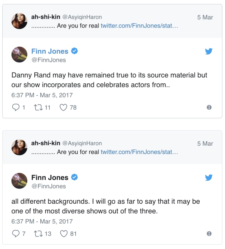 Meanwhile, the people who were challenging Jones faced problems of their own; Asyiqin Haron, of Geeks of Color, was forced to protect her own tweets after suffering online harassment. One thing's for sure; this series is truly set to be controversial.