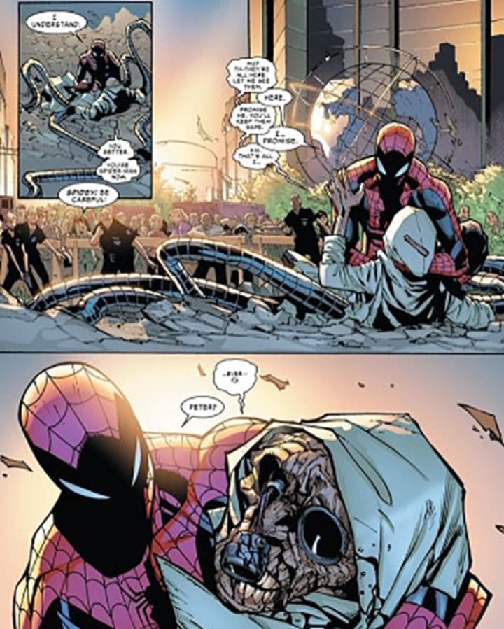 Even in The Superior Spider-Man, when faced with losing everything and Doc Ock taking his place, Peter Parker chooses to use his final moments to tell Octavius everything he needs to know about being a hero. Peter wants to know that the people he vowed to protect are left in the safe hands of a capable Spider-Man — even if he is not the one to protect them anymore.