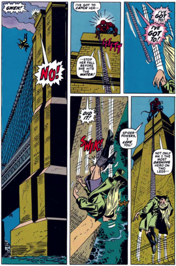 Gwen was of course part of one of the biggest comic book stories of the 1970s with The Night Gwen Stacy Died. Of course this story goes down as a turning point in both the history of Spider-man and of comic books as a medium. Before this story a superhero had never failed so catastrophically unless it was part of their origin story, never before had one of the main supporting cast who had been well established been killed by a major villain. This of course had a huge ripple effect on Peter Parker's character, he found it very difficult to get over the murder of the woman he loved and there was always the lingering doubt that it was actually him that caused it. Stories since have shown that this had a massive effect on Peter, particularly the Spider-Man: Blue story. Spider-Man: Blue shows Peter taping messages to Gwen long after her death, he tells the story of how they fell in love and how much he misses her. Clearly, even though Peter has moved on and had a life with Mary Jane Gwen still holds a special place in his heart. This is also shown in the Spider-Verse storyline when the newly introduced Spider-Gwen appears, Peter is very protective of her and will not let her come out to save the universe which leads to one of the other Spideys having to explain to her what happened.