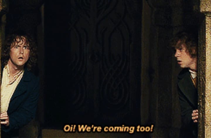 Close behind, Pippin jumps on the bandwagon after Merry has initiated the ride, excited by the opportunity to be a friend and just be in the midst of the new thing happening.