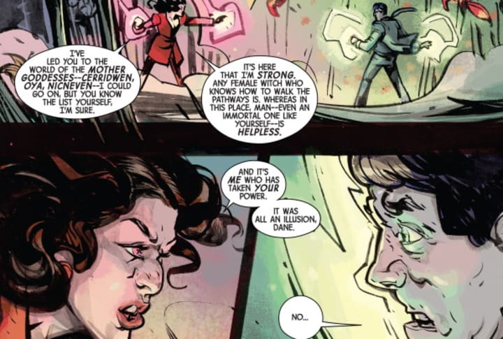 The three witches discover the Goddess of Witchcraft battling, and struggling, against a Chaos entity, and work together to help drive the entity away. Unfortunately, the Goddess is seriously injured, so Natalya sacrifices her own soul to the Goddess to ensure magic lives on. Agatha is miraculously restored to life, likely as a reward for her role in helping the Goddess. Wanda found the whole adventure surprisingly healing, resolving to officially rejoin the Avengers.