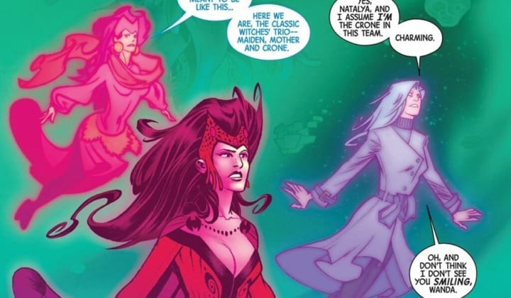 Towards the end of the story, Wanda learns that to repair the world's broken magic, Wanda must travel further down the Witches' Road than any before her have reached. She is accompanied by the spirits of her biological Mother, Natalya, and Agatha Harkness, with the three of them forming the mystical trio of Mother, Maiden, and Crone.
