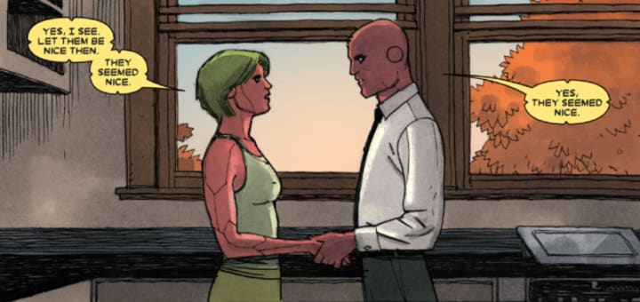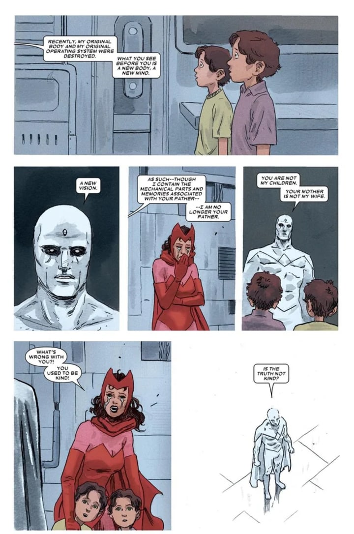 Unfortunately, Vision's use of Wanda's brain patterns in creating Virginia, and a subconscious desire to recreate the family he had once lost (Wanda, and their twin sons Tommy and Billy), leads to most of the tragedies that unfold in the twelve issues of 'The Vision'.