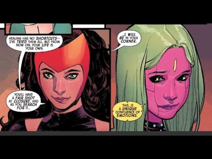 Issue #7 of 'The Vision' entails a deep-dive flashback into Wanda and Vision's relationship, and it's aftermath. While Vision does eventually regain his emotions, Wanda had by then moved on with Simon, telling Vision she believes the relationship worked because of Simon's brain patterns.