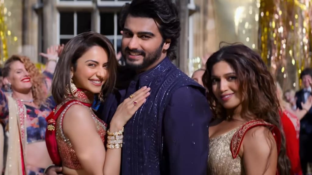 The director of Mere Husband Ki Biwi tinkers with the conventional, high-pitched romantic comedy formula, in which the hero is unconfounded even though he is serenading two attractive girls. Arjun Kapoor plays Ankur Chadha, a real estate broker who is trying to heal from a difficult marriage to journalist Prabhleen Dhillon (Bhumi Pednekar). He finds support in Antara Khanna (Rakul Preet Singh), a physiotherapist who helps him move on. She pulls out an old college album to impress him, all while feigning the creation of a healthier version of a dish to attract an audience that still enjoys classic comedies, even as discussions around the "male gaze" and "patriarchal lens" emerge. Although his efforts introduce some new perspectives—may be a welcome shift—the underlying pretence doesn't always disappear.