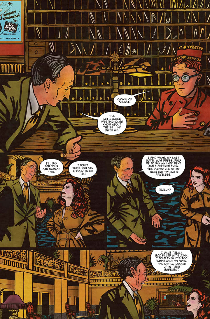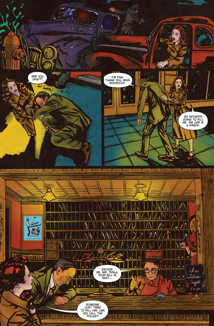 I am very much enjoying the way that this is being structured and how we see the layers within the story growing, evolving and new ones emerging. This keeps the story strong, complex and engages the reader exceptionally well throughout to the last page. How we see everything working together to create the story’s ebb & flow as well as how it moves the story forward is beautiful to see. There is a natural way that this flows so that the events we see occurring almost match up perfectly with the way we know the history of Tesla and that’s pretty damn sweet in its own right.