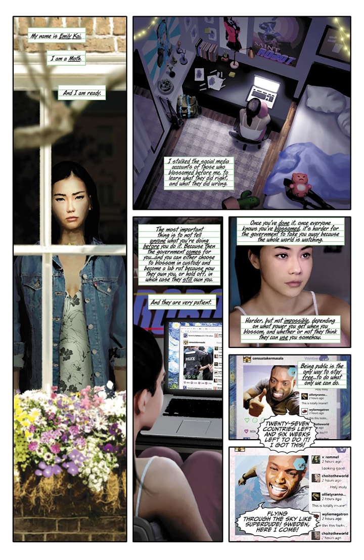 I found myself drawn into this in some beautiful ways. We see Emily’s reasoning here and why she wants to see what her power is and to hopefully help folks in the world with it. When you have something and you don’t know what it is but you can feel it coursing through your body you want or better yet have that need to know what it is. I know when I got sick I knew there was something inside me before I even went to the Doctor so when they confirmed it I knew it was better to know than live blindly. This power that she has works the same way, once it becomes active you’ve got a limited life span left and the cost of power takes its toll on the body and burns it out. It is a brilliant aspect and one that many different people can connect to.