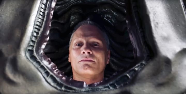 As much as we look forward to Cronenberg’s ideas, many others come to Cronenberg for the unique forms of special effects and body modifications. Cronenberg does not disappoint in Crimes of the Future. Saul has an incredible floating bed that cares for him through the night, a chair that looks like a human skeleton covered in new skin that rotates to help him digest food, and what used to be an autopsy machine that Saul and Caprice have modified for their surgical performances. Each of these set pieces are extraordinary in their own way.