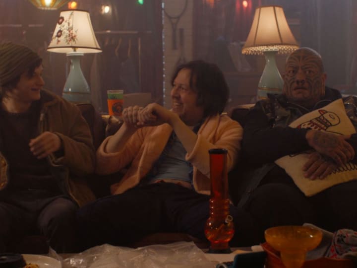 Pineapple Tangaroa is a beloved figure in the Austin, Texas scene, a tattoo artist who fancies himself a Shaman. When he enters Drunk Bus the movie begins to take on his energy, low key yet unpredictable. Not a trained actor, Pineapple has no affectations, he doesn’t appear performative, and he’s very charismatic, even beyond his many body modifications. You very much believe that he would charm his way into Michael’s heart as his new best friend and guru.
