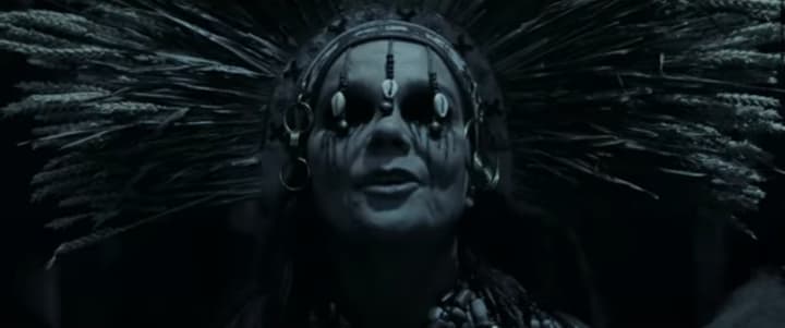 In the wake of their latest pillaging, Amleth meets a woman called The Seeress (Bjork) among the burned remains of a building Berserkers had set on fire with women and children inside. The Seeress hands Amleth a frozen tear, one he’d shed himself during a ritual with his father and a crazed shaman, played by Willem Dafoe. The Seeress reminds Amleth of his vow of revenge and tells him how his vengeance will be carried out with a cursed sword at the side of a lake of fire at the Gates of Hell.