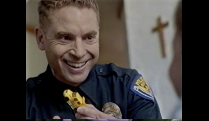 Survival Skills stars Vayu O’Donnell as Jim. Jim is the star of a police training video in the small town of Middletown U.S.A. Middletown is a place so patriotic and steeped in the American mythos that the town voted for Ronald Reagan in 1988 even though he wasn’t on the ballot. Stacy Keach portrays the narrator of the training video. He introduces Jim as a 30 year old rookie on the force, a naive man eager to serve and the desire to help people.