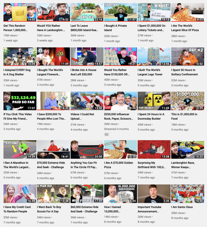 If you have not seen his videos on YouTube, I personally recommend watching this video to see how much impact MrBeast has that changes our world. His videos are well edited to keep views attention though every second of the video. On average they are under 20 minutes long with some exceptions with less edited live videos.