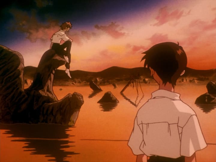In the original run, we don't get to see any of the action. Parts of the two-episode finale take place inside of the character's heads while the Third Impact goes on outside in real time. It's a well crafted psychological inspection and analysis of what the characters are going through, seeing the world around them burn and collapse. Shinji's decisions in End of Evangelion are explained through a cognitive lens in 25+26 and why he decided to trigger the Third Impact.