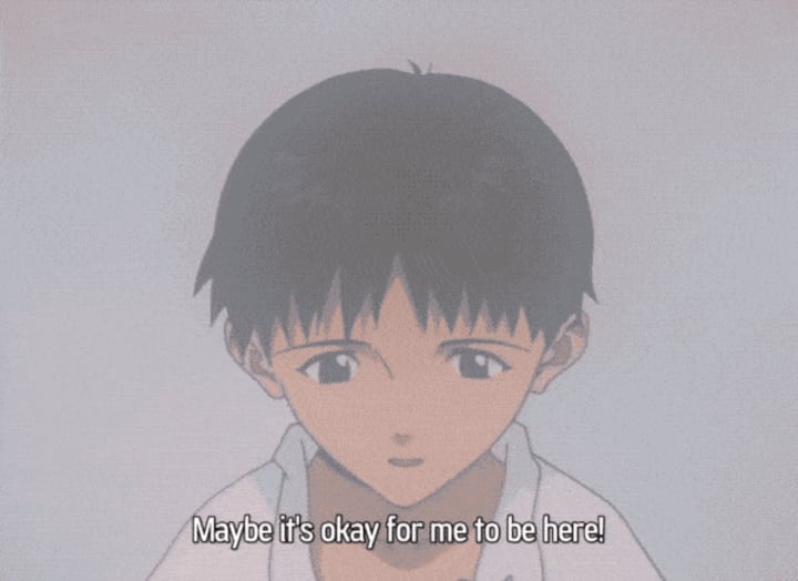 Shinji Ikari was created in a way to tell the story of self-discovery and positive identity, and not about saving the world. For the world he eventually goes on to save is the one inside him, the creatures he defeats are vices like existential dread, loneliness and the need for external validation. The realization that getting rejected and hated on is completely okay, because when the good things come, which they will eventually, experiencing the not so good things first will make them much more worthwhile. Shinji pilots the EVA Unit-01 because he thinks that if he does so, other people will need him. They'll need him to save the world. That they'll give him value. But by the end he realizes that the only person who can give him value is himself. He's willing to come back and live his life, because he feels like maybe, maybe he can start to love himself instead of cowering in an existential space where he has no flaws and no responsibilities. In the brilliant finale of the original series, Shinji overcomes his fear of inadequacy and decides that he has a right to live his life, to exist in this world, to grow and change himself.