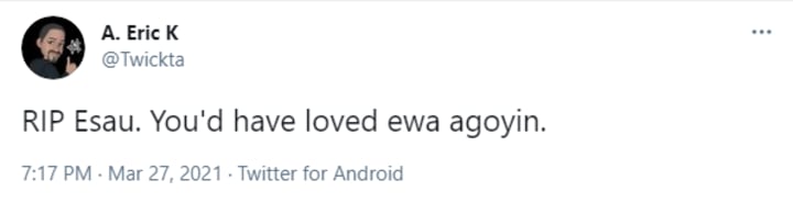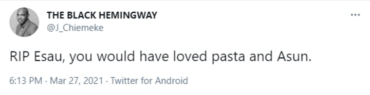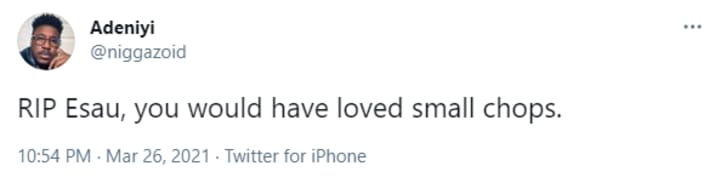 😂 I love these ones so much. Honestly RIP Esau, you would have loved Nigerian food scatter!!