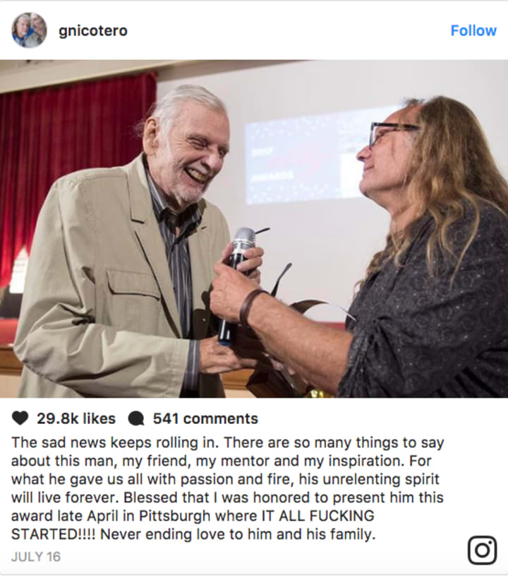 “The sad news keeps rolling in. There are so many things to say about this man, my friend, my mentor and my inspiration. For what he gave us all with passion and fire, his unrelenting spirit will live forever. Blessed that I was honored to present him this award late April in Pittsburgh where IT ALL F*CKING STARTED!!!! Never ending love to him and his family.”