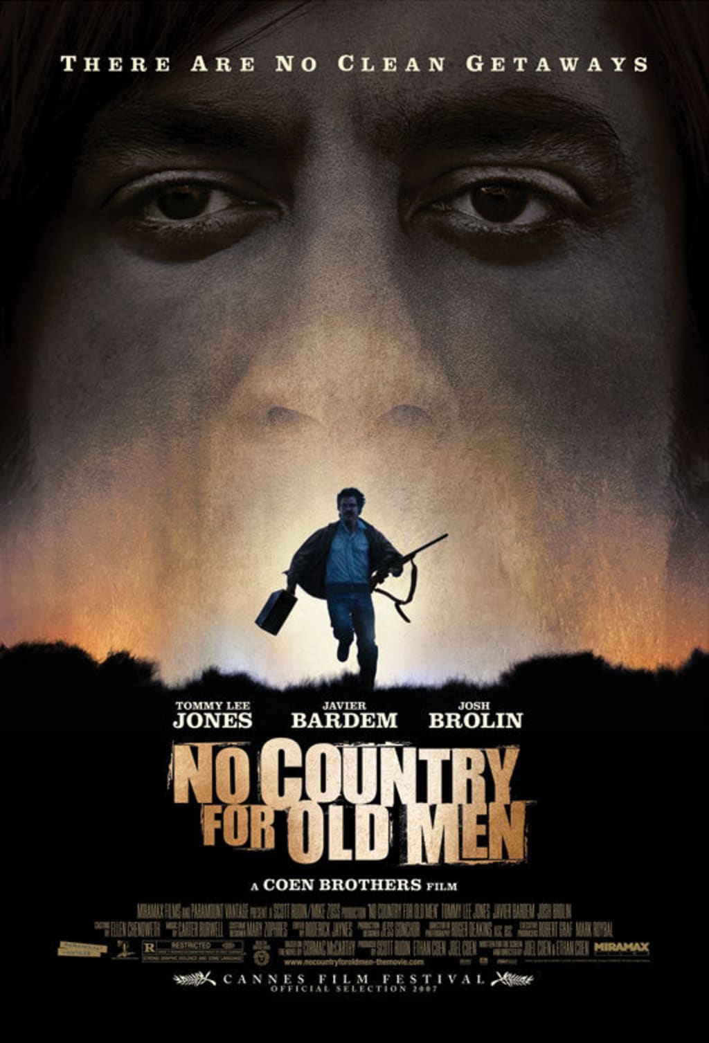 No Country for Old Men is a 2007 neo-western/thriller directed by Joel and Ethan Coen, based on the novel of the same name by Cormac McCarthy and starring Tommy Lee Jones, Javier Bardem, and Josh Brolin. This bleak, nihilistic tale tells a story of morality, causality, and the inevitability of death. One day while hunting, Llewelyn Moss finds the aftermath of a drug deal gone wrong: most of the gang members dead and a briefcase containing 2 Million dollars. The only survivor begs Llewelyn for water, but he ignores him and leaves with the money. That night, haunted by guilt, he returns to the scene to deliver water to the dying man, only to find out that he's already dead. This simple act of consciousness leads to his downfall, as it alerts the ruthless assassin Anton Chigurh (who is looking for the money) of his existence and things start to spiral into chaos. In the middle of all this is Sheriff Ed Tom Bell, who is trying to make sense of all the mess and come to terms with the world changing around him.