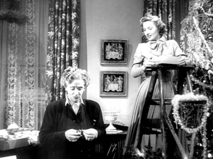 Christmas can be about Santa Claus and magic and finding hope again, à la the Hallmark menu. But good writing might suggest that it is more often about awkwardness, keeping ourselves under wraps, restrained and polite, fraying at the edges. Stanwyck is so good at that. At playing with the boundaries of respectability, a natural wariness of good people, repressed fear at being found out. And the occasional “Stanwyck Scene”, the burst of emotions, the stillness giving way to the banging of fists into a door or a masculine chest.