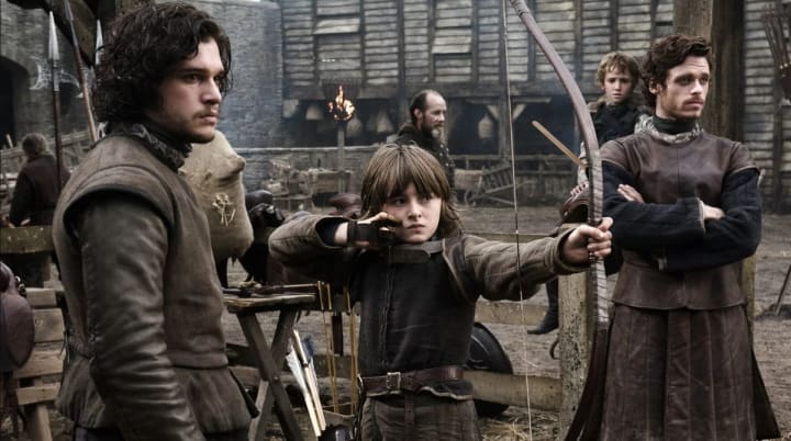 An Image from the Game of Thrones Season One Pilot Featuring Robb Stark, Bran Stark, and Jon Snow in the Forefront
