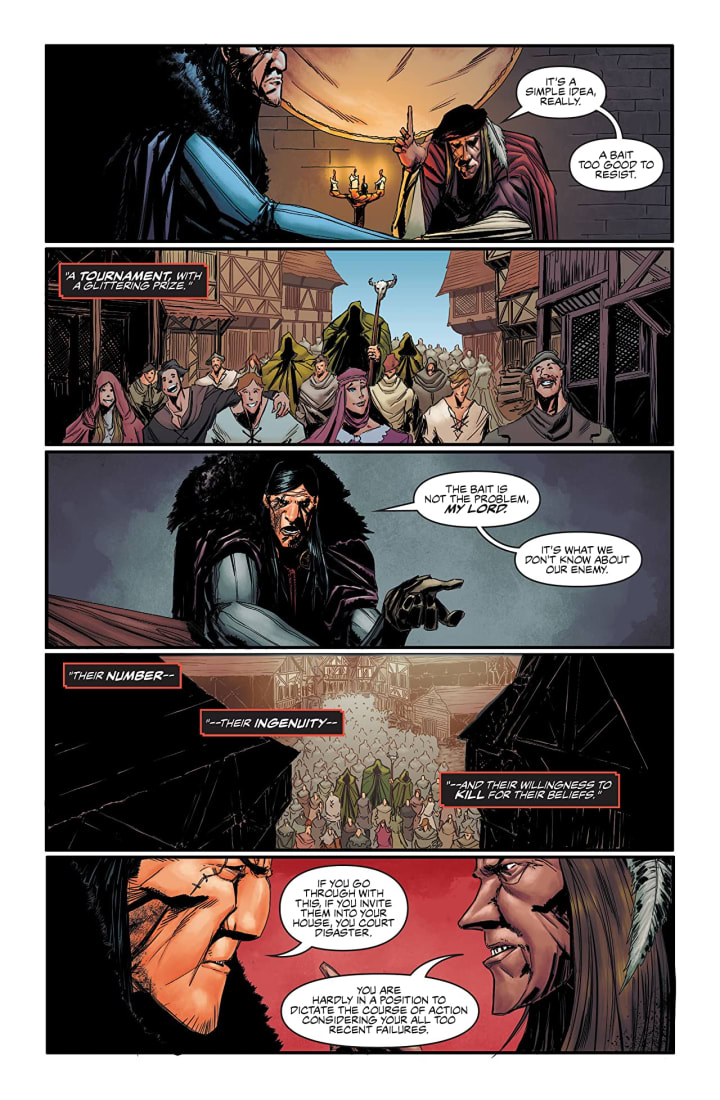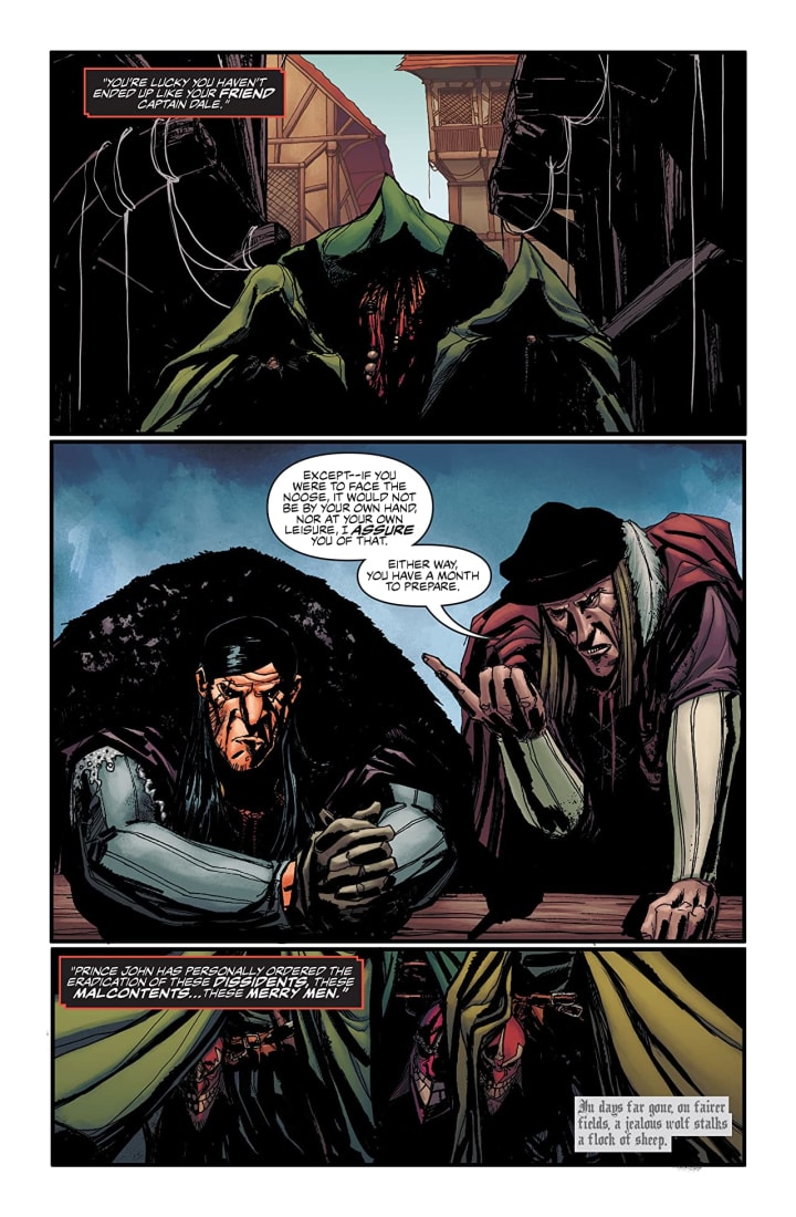 Well this issue everything changes as Sir Robert of Locksley’s plans come to life exposing him to Marian as the fraud that he is for all the good that will do her. Last issue we saw his thoughts on Marian and I have to say that this issue definitely changes the way that I see him and his band of Merry Men as well as the Sheriff. Ironically there isn’t anyone in this story to actually like and root for which is something I’ve never experienced before so I doth my cap to David for being able to write a story in which the readers alliance to characters can change as swiftly as simply turning the page. It truly makes this a unique and fascinating story the likes of which we’ve really never seen before.