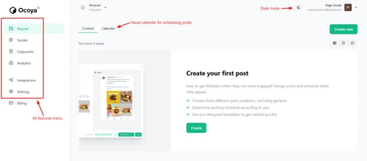 Users can find all important features such as content planner (which is the main starting dashboard screen), Social profiles, Ai copywriter etc on the left hand side menu.