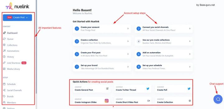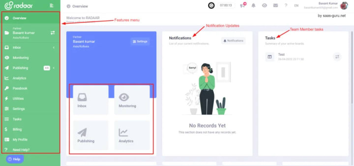 Like radaar and ocoya, users can find all features on left side menu. And to make the onboarding process easy they have a account setup steps for guiding users.